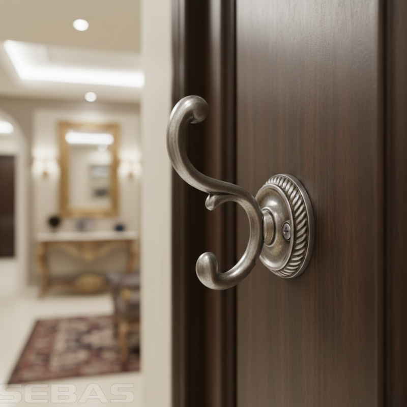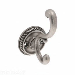 Rustikaler Kleiderhaken GALILEO in eleganter Ausführung Alt-Silber ist ein stilvolles und funktionales Accessoire für klassische sowie rustikal gestaltete Innenräume. Der reich verzierte doppelte Haken in Kombination mit einer dekorativen runden Rosette verleiht dem Haken einen traditionellen Charakter und einen markanten visuellen Effekt.