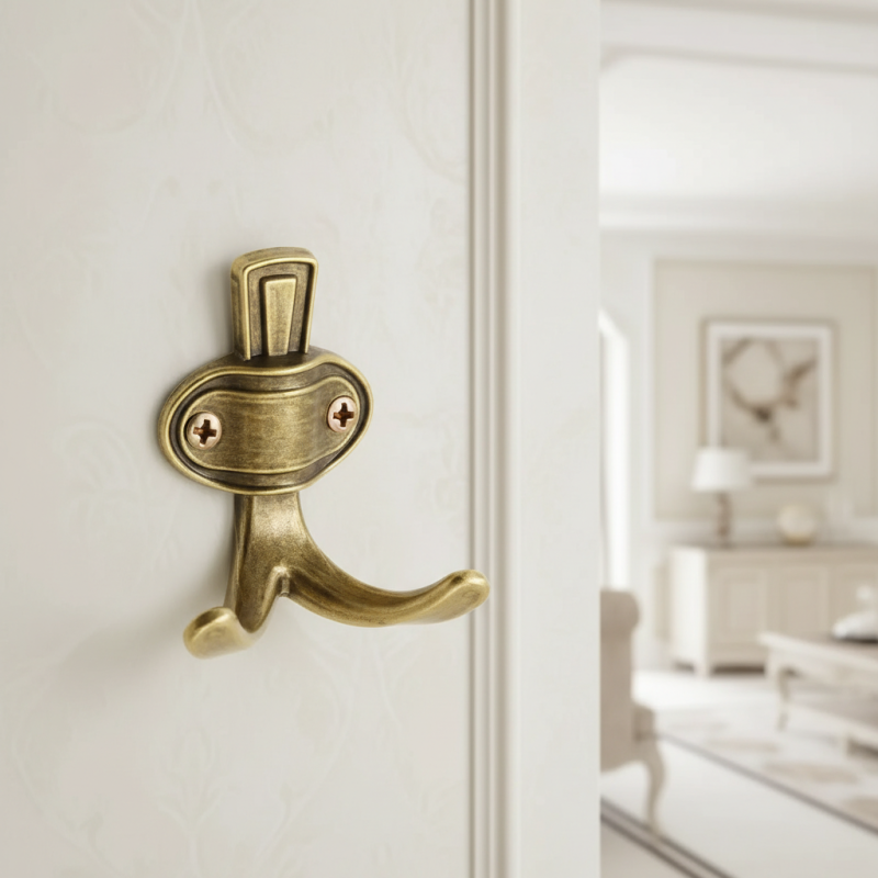 Die Ausführung in Altgold verleiht dem Haken ein elegantes historisches Aussehen, das Holzmöbel und rustikale Innenräume wunderschön ergänzt.