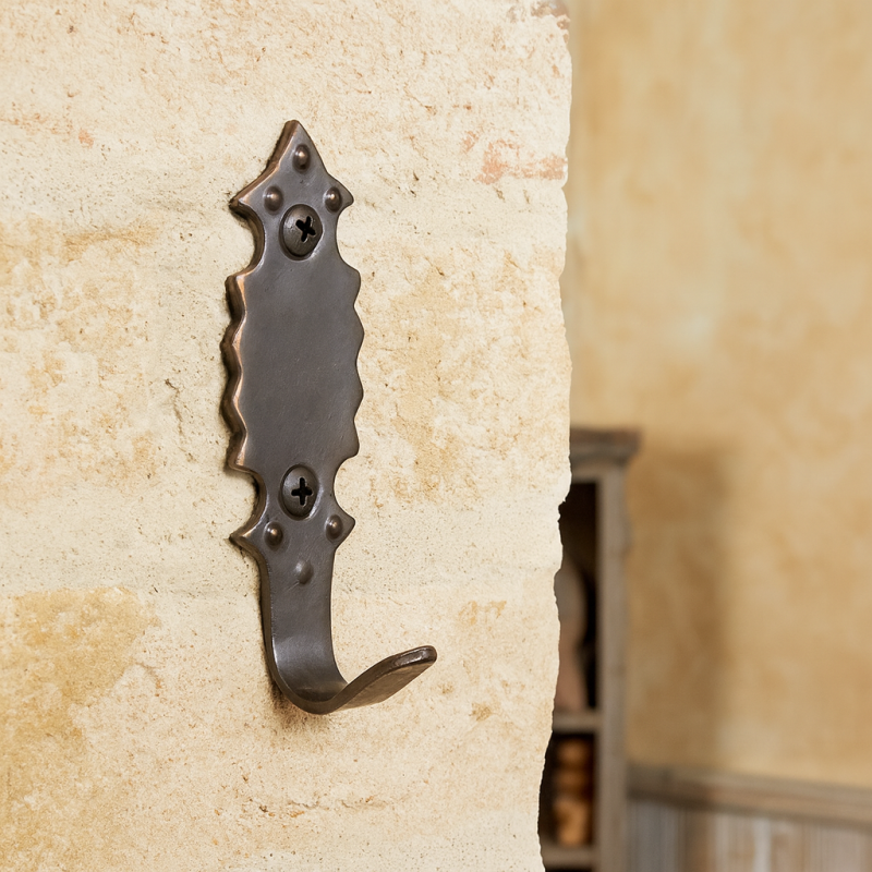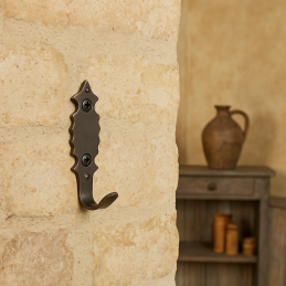 Stilvoller rustikaler Möbelhaken in der Ausführung Messing, der jedem Interieur einen eleganten und historischen Touch verleiht. Er ist ideal für den Einsatz in stilvollen Möbeln, an Türen, Schränken oder Wänden in Innenräumen mit klassischem oder Vintage-Charakter.