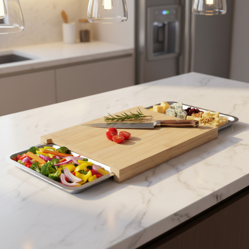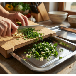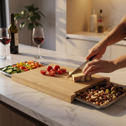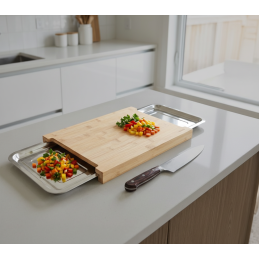 Das Bambus-Schneidebrett mit Behältern ist die ideale Kombination aus Praktikabilität, Ästhetik und Hygiene, die die tägliche Küchenarbeit angenehmer macht.