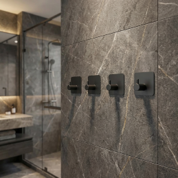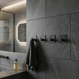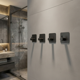 Schlichter und designorientierter Kleiderbügel, geeignet für Bad oder Küche. Auf der Rückseite befindet sich ein doppelseitiges Klebeband, das Sie einfach an die Stelle kleben, an der der Aufhänger angebracht werden soll.
