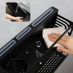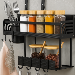 Praktisches hängendes Küchenregal XENIA in mattem Schwarz ist eine multifunktionale Lösung für den modernen Haushalt. In einem kompakten Produkt vereint es Gewürzhalter, Messerständer und Besteckabtropfer, sodass Ihre Küche übersichtlich und ordentlich bleibt.