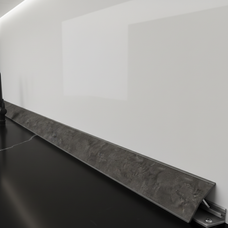 Sie besteht aus zwei Teilen – der untere Teil wird verschraubt oder geklebt auf die Arbeitsplatte und der obere wird anschließend eingeklickt in den unteren Teil. So entsteht ein einheitlicher, stabiler und ästhetischer Abschluss im gleichen Dekor wie die Arbeitsplatte.