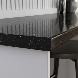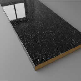Die elegante und exklusive KRONOSPAN Arbeitsplatte im Dekor Andromeda Schwarz Hochglanz (K218 GG) besticht durch ihr modernes, luxuriöses Aussehen mit einem dezenten, glitzernden Effekt, der an einen Sternenhimmel erinnert. Dieses Dekor verleiht dem Raum einen tiefen und dramatischen Kontrast, der in jeder Küche oder jedem Interieur stilvoll und hochwertig wirkt.