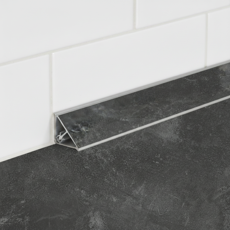 Sie besteht aus zwei Teilen – das Unterteil wird angeschraubt oder geklebt auf die Arbeitsplatte und das Oberteil wird anschließend eingeklickt in das Unterteil. So entsteht ein festes, präzises und einheitliches Abschlussprofil im gleichen Dekor wie die Arbeitsplatte.