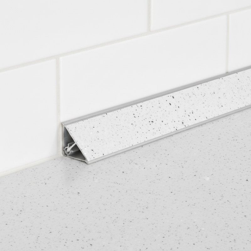 Elegante und zeitlose Abschlussleiste KRONOSPAN im Dekor Andromeda Weiß matt (K217 GM) ist für den professionellen und ästhetischen Abschluss von Arbeitsplatten bestimmt. Die Leiste dichtet die Verbindung zwischen Arbeitsplatte und Wand zuverlässig ab und verhindert so wirksam das Eindringen von Wasser und Schmutz. Gleichzeitig verleiht sie der Küche ein dezentes, sauberes und modernes Aussehen von weißem Marmor mit feinem Glitzereffekt und matter Oberfläche.