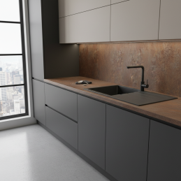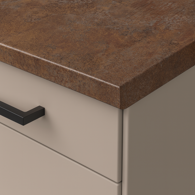 Die Arbeitsplatte EGGER Ferro Bronze (F302 ST87) vereint industrielles Design und moderne Eleganz. Die Oberfläche im warmen Bronzeton mit feiner metallischer Struktur verleiht der Küche oder dem Arbeitsbereich ein luxuriöses, zeitloses Aussehen.