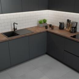 Die Platte besteht aus hochwertiger Spanplatte mit EGGER-Laminatoberfläche, die hohe Beständigkeit gegen Abrieb, Kratzer, Feuchtigkeit und Hitze gewährleistet. Ideal für Küchenarbeitsplatten, Büroräume oder moderne Interieurs mit industriellem Charakter.