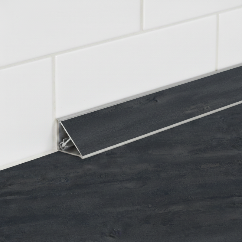 Moderne und stilvolle Abschlussleiste KRONOSPAN im Dekor Charcoal Flow (K353) ist für den professionellen und präzisen Abschluss von Arbeitsplatten bestimmt. Die Leiste dichtet die Verbindung zwischen Arbeitsplatte und Wand zuverlässig ab und verhindert so wirksam das Eindringen von Wasser und Schmutz. Gleichzeitig verleiht sie der Küche ein industrielles, elegantes und dunkles Beton-Design mit einem dezent metallischen Unterton.
