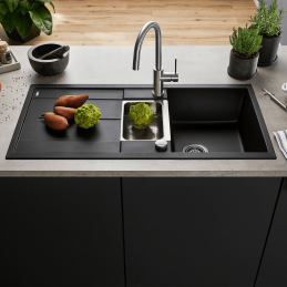 Blanco Metra 6 S ist ein praktisch und designtechnisch durchdachtes Granitspülbecken für die Küche eines renommierten Herstellers BLANCO. Es handelt sich um ein Einzelbecken mit Abtropffläche, ergänzt durch eine kleinere Zusatzschale, die den Komfort bei der täglichen Nutzung deutlich erhöht – vom Abspülen von Lebensmitteln bis zum Sortieren des Geschirrs.