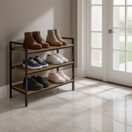 Bringen Sie Ordnung mit Eleganz! Der MAGNA Schuhregal vereint Funktionalität, Stil und Langlebigkeit in einem Designerstück. Die Kombination aus schwarzem Metallrahmen und Holz in warmem Farbton schafft einen modernen Loft-Look, der Ihrem Flur, Ihrer Garderobe oder Ihrem Büro Gemütlichkeit und Harmonie verleiht.