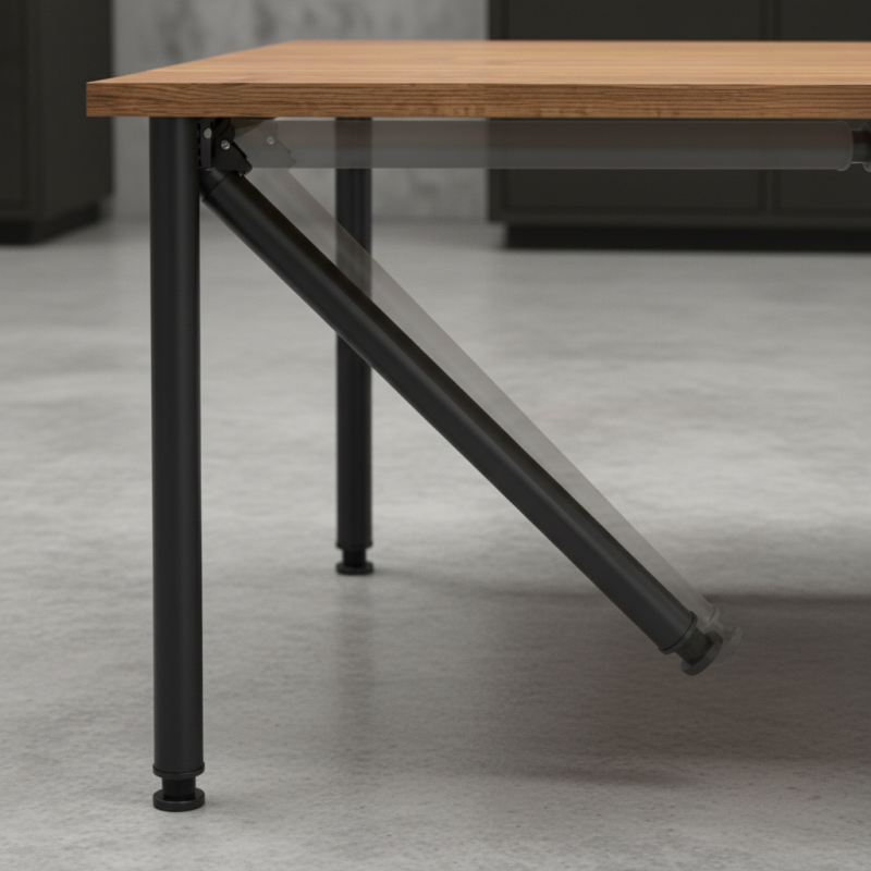 Der Mechanismus im oberen Teil ermöglicht das einfache Einklappen des Beins, sodass Arbeitsplatten im Schrank versteckt, Regale abgesenkt und angehoben oder der Tisch bequem zusammengeklappt werden kann.