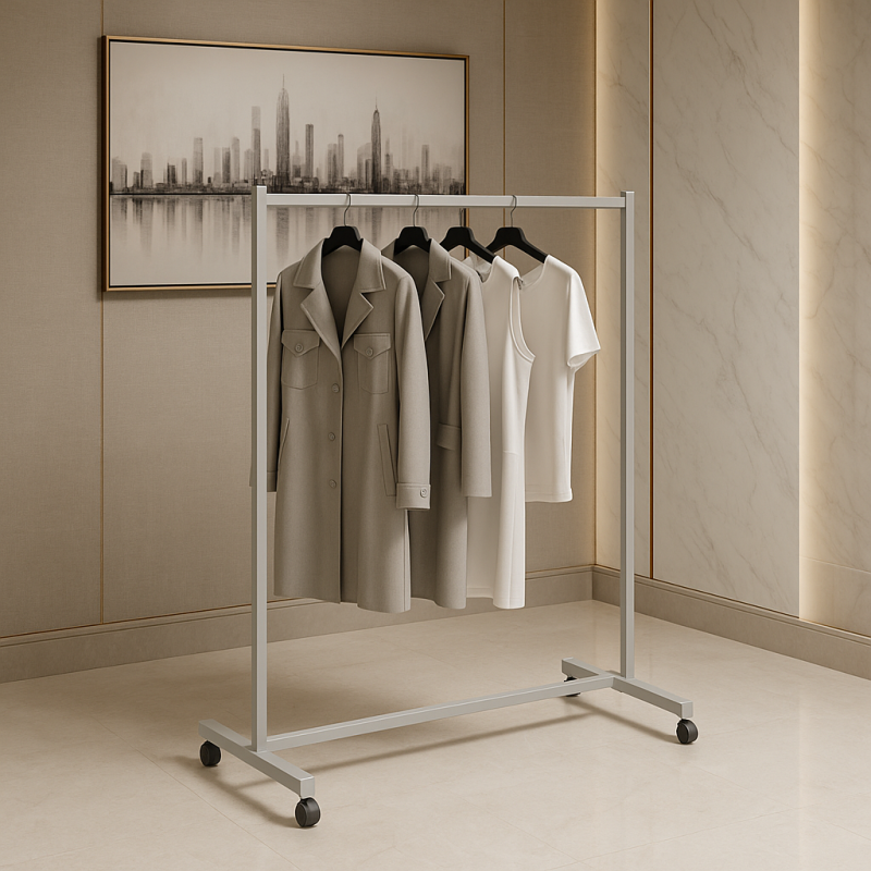 Geeignet für Flur, Ankleidezimmer, Schlafzimmer, Büro oder Boutique. Neben dem oberen Hängeplatz bietet er auch ein unteres Ablagefach für Schuhe oder Accessoires.