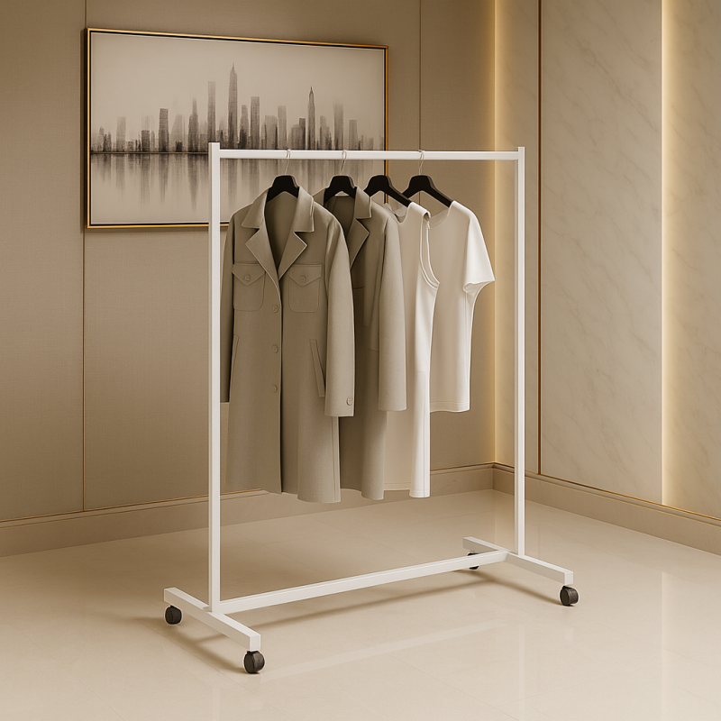 Geeignet für Flur, Ankleidezimmer, Schlafzimmer, Büro oder Boutique. Neben dem oberen Hängeplatz bietet er auch ein unteres Ablagefach für Schuhe oder Accessoires.