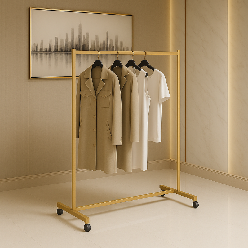 Geeignet für Flur, Ankleidezimmer, Schlafzimmer, Büro oder Boutique. Neben dem oberen Hängeplatz bietet er auch ein unteres Ablagefach für Schuhe oder Accessoires.