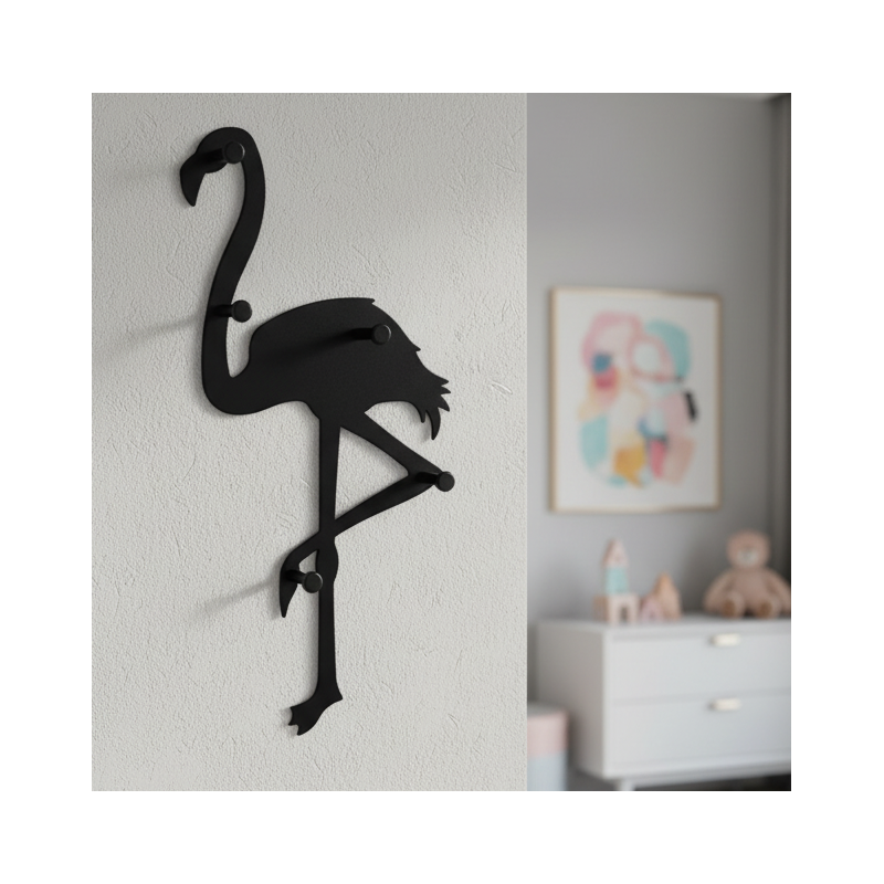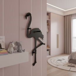 Stilvolle Wandgarderobe FLAMINGO in mattem Schwarz ist ein originelles Accessoire, das sofort die Aufmerksamkeit auf sich zieht. Die Silhouette des Flamingos wirkt modern, verspielt und passt perfekt in Kinderzimmer, Flure, kreative Räume oder in minimalistisch oder skandinavisch eingerichtete Interieurs.