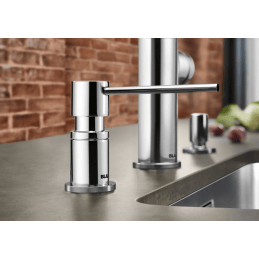 Seifenspender. Die Dosierung erfolgt von oben. Das Fassungsvermögen des gesamten Behälters beträgt 500 ml. Verschiedene Farbvarianten.